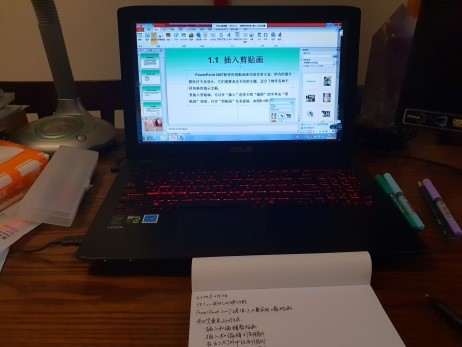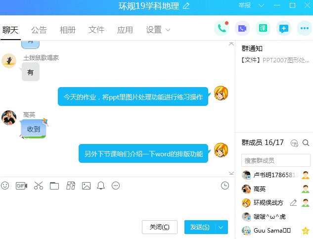 本门课程前4章主要介绍PowerPoint2010的简介、PPt的课件制作培训概述、图形处理功能,多媒体课件制作,MOOC课件制作等,根据教学内容安排,分别制作了相应的PPt课件,并借助中国大学MOOC、微信群和QQ群教学平台实施教学。为了解学生的学习状态和模拟面对面授课氛围,督促学生认真听课,上课采用微信群和QQ群多人视频交流群,实时督促学生完成学习任务(图1)。