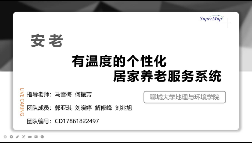 12月9日,2021年SuperMap杯高校GIS大赛获奖结果公布,太阳成集团tyc334553S实验室收获颇丰,共获得一等奖两项,二等奖两项,三等奖一项,太阳成集团tyc334553S实验室成员郭亚琪、刘晓婷、解修峰、刘兆旭在马雪梅、何振芳两位老师的指导下,《安老——有温度的个性化居家养老服务系统》在众多作品中脱颖而出,荣获本次大赛开发组二等奖。