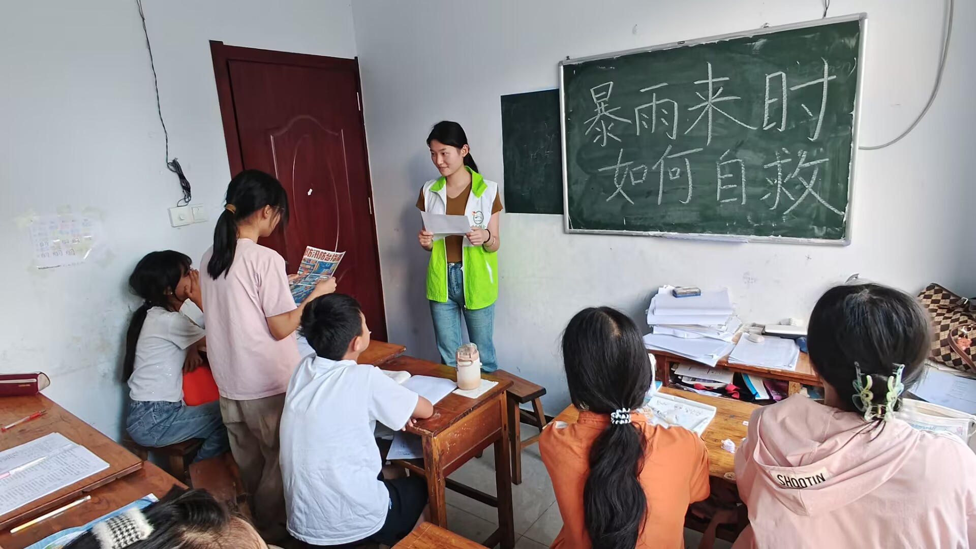 在活动过程中,实践队队员注重将理论指导与实践运用相结合,通过发放与讲解相关海报,引导学生们体验和学习正确的应急避险技能。在讲解山洪暴发的环节时,实践队队员着重强调应如何正确选择向两侧高地转移的路径,而在模拟山体滑坡的情境中,学生们则通过学习,掌握了在滑坡发生时如何精准地选择垂直于滑坡方向的逃生路线等技巧。