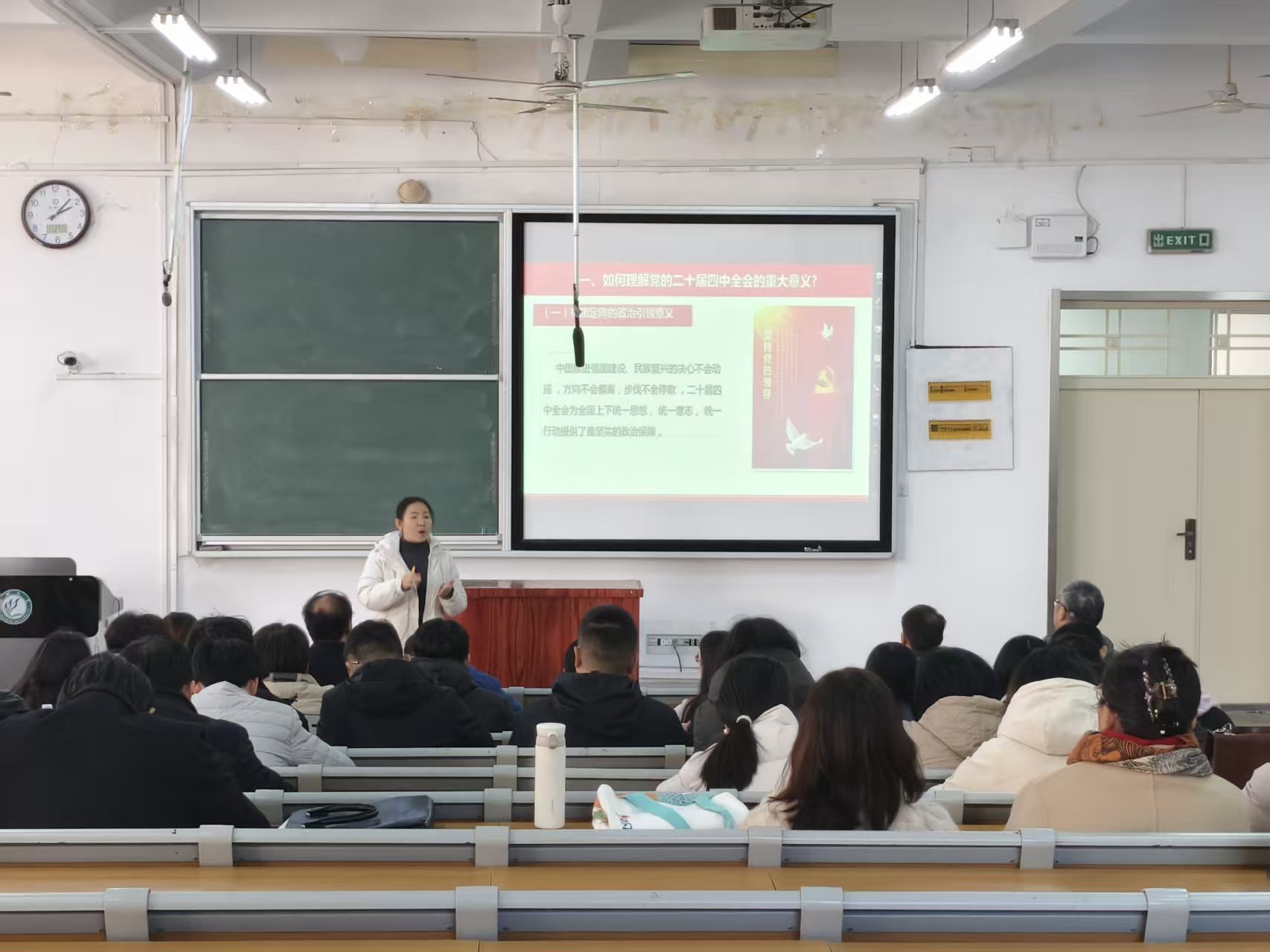 报告会上,孙静老师以“总结‘十四五’成就、擘画‘十五五’发展蓝图”为核心,系统解读全会精神。她指出,党的二十届四中全会作为承前启后、继往开来的关键会议,具有多重核心意义——既紧扣“第二个百年奋斗目标”与2035年中期目标,又以习近平新时代中国特色社会主义思想为指引,实现马克思主义治国理政理论创新,更坚守“以人民为中心”,让发展成果惠及全体人民,为全面建设社会主义现代化国家指明了方向。
