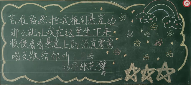 精彩纷呈的板书展现了同学们对传统文化的热爱和尊重,启发同学们对生活、自然和人生哲理的深层思考,展现了学院的活力与魅力,传递了学院的精神风貌,营造了积极向上的校园文化氛围。让我们携手努力,共同为打造更加丰富多彩的校园文化贡献力量!