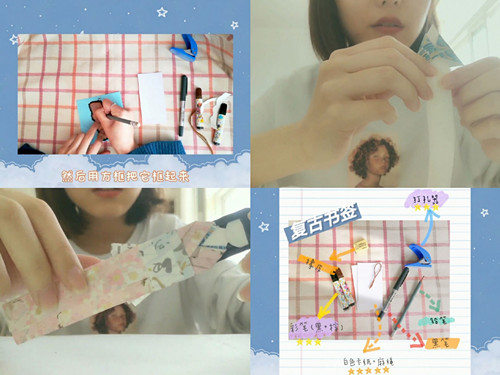 读万卷书,行万里路。此次创意书签大赛面向全院学生展开,采用线上评比的方式进行,要求参与者将制作书签的过程以录制视频的方式记录。同学们积极报名,踊跃参与,通过一张张书签凝聚创意,充分展现了同学们乐于动手,善于创新的优秀品质。在同学们制作的书签中,王硕的作品尤其突出,她以和服娃娃为灵感创作,采用多种色彩的卡纸制成娃娃衣物,成品书签精美小巧,赢得了在线评委的一致好评。解淼的作品别出心裁,她通过复古旅游书签于家中开展云旅游,制作书签朴实并极具美感,视频剪辑自然流畅,格外引人注目。