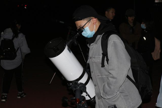 领略天文魅力,感知壮美星空。活动开始后,主持人简要介绍各星系的基本知识,以及有关月亮的美好传说,同时详细解说了天文望远镜的组成部分及使用方法。负责人现场调试设备,并将每台设备对准不同的方位,使同学们能够从多角度全面地观测到繁星,同学们有序排队观测,工作人员在一旁细心解答同学们有关天文知识的疑惑,现场的氛围逐渐活跃起来。透过望远镜,星空与月亮灿若宝石、映美苍穹,构成一幅扣人心弦的壮丽画卷。赏星空银河,与大地共呼吸,在场同学无不被辽阔浩渺的星空深深吸引,陶醉其中。整场活动精彩纷呈,活动结束后,同学们意犹未尽,仍然沉浸于浩瀚繁星的神秘之中。