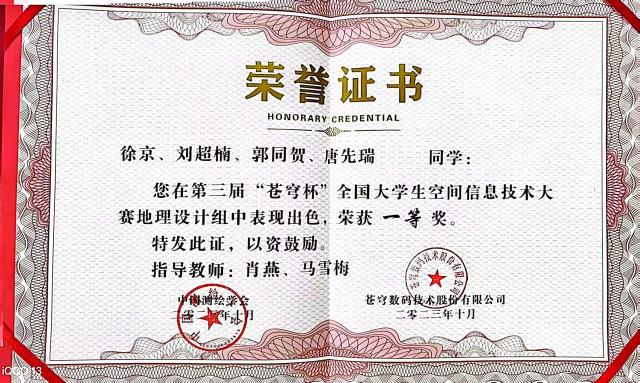热烈祝贺太阳成集团tyc33455徐京、刘超楠、郭同贺、唐先瑞同学获得第三届“苍穹杯”全国大学生空间信息技术大赛分析组一等奖。此奖项的获得充分体现了徐京、刘超楠、郭同贺、唐先瑞同学的勤奋努力、艰苦奋斗,同时也为我校争得了荣誉。在此,向徐京、刘超楠、郭同贺、唐先瑞同学表示真挚的祝贺。