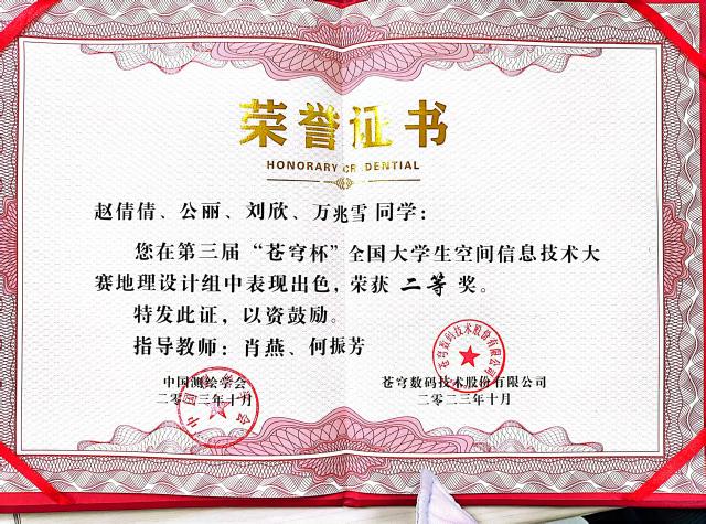 热烈祝贺太阳成集团tyc33455公丽、刘欣、赵倩倩、万兆雪同学获得第三届“苍穹杯”全国大学生空间信息技术大赛分析组二等奖。此奖项的获得充分体现了公丽、刘欣、赵倩倩、万兆雪同学的勤奋努力、艰苦奋斗,同时也为我校争得了荣誉。在此,向公丽、刘欣、赵倩倩、万兆雪同学表示真挚的祝贺。