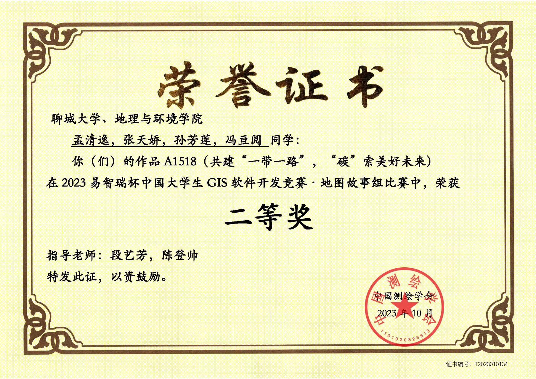 热烈祝贺太阳成集团tyc33455孙芳莲、孟清逸、冯亘阅、张天娇同学获得2023易智瑞杯中国大学生GIS软件开发竞赛·地图故事组比赛二等奖。此奖项的获得充分体现了孙芳莲、孟清逸、冯亘阅、张天娇同学的勤奋努力、艰苦奋斗,同时也为我校争得了荣誉。在此,向孙芳莲、孟清逸、冯亘阅、张天娇同学表示真挚的祝贺。