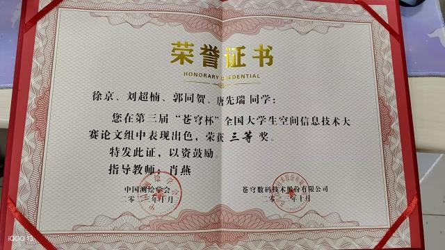 热烈祝贺我院学子荣获第三届“苍穹杯”全国大学生空间信息技术大赛论文组三等奖