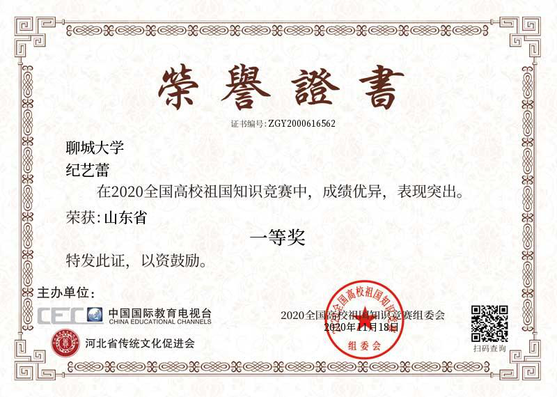 纪艺蕾在2020全国高校祖国知识竞赛中获得一等奖
