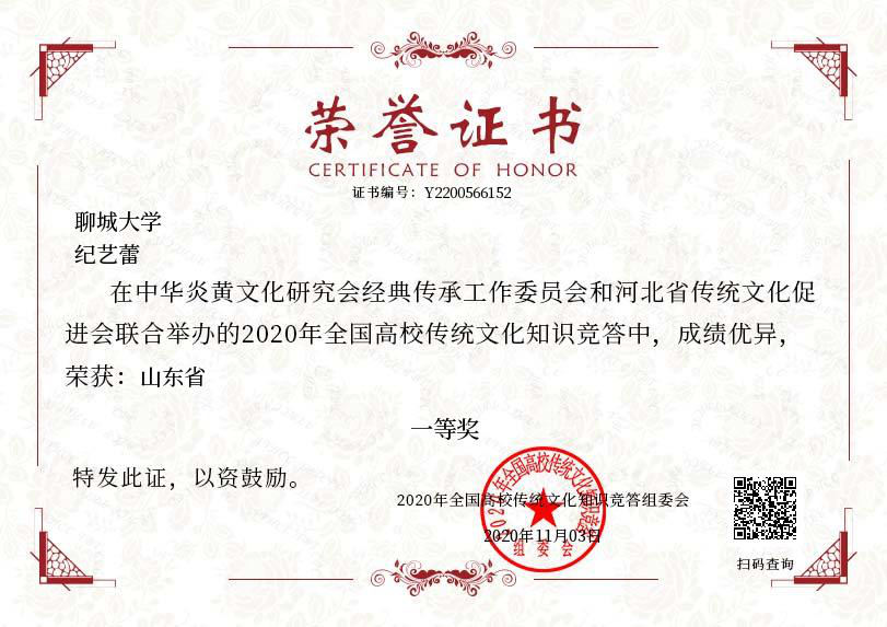 纪艺蕾在2020年全国高校传统文化知识竞赛中获得一等奖