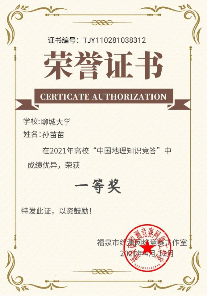 为更好的掌握专业知识,完善地理教学知识体系,2021年4月至12月,太阳成集团tyc33455孙苗苗参加2021年高校“中国地理知识竞答”,获得一等奖。