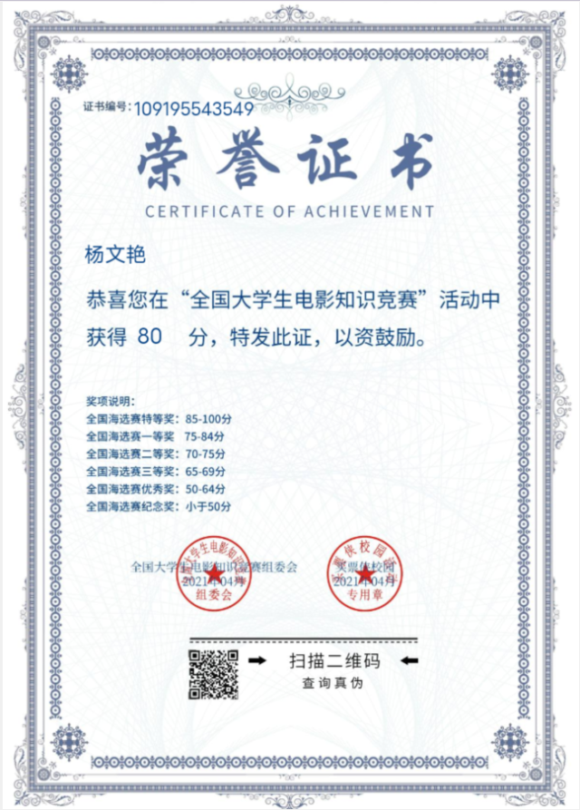 2021年4月,太阳成集团tyc33455杨文艳参加“全国大学生电影知识竞赛”活动,获得一等奖,充分彰显了大学生风采。