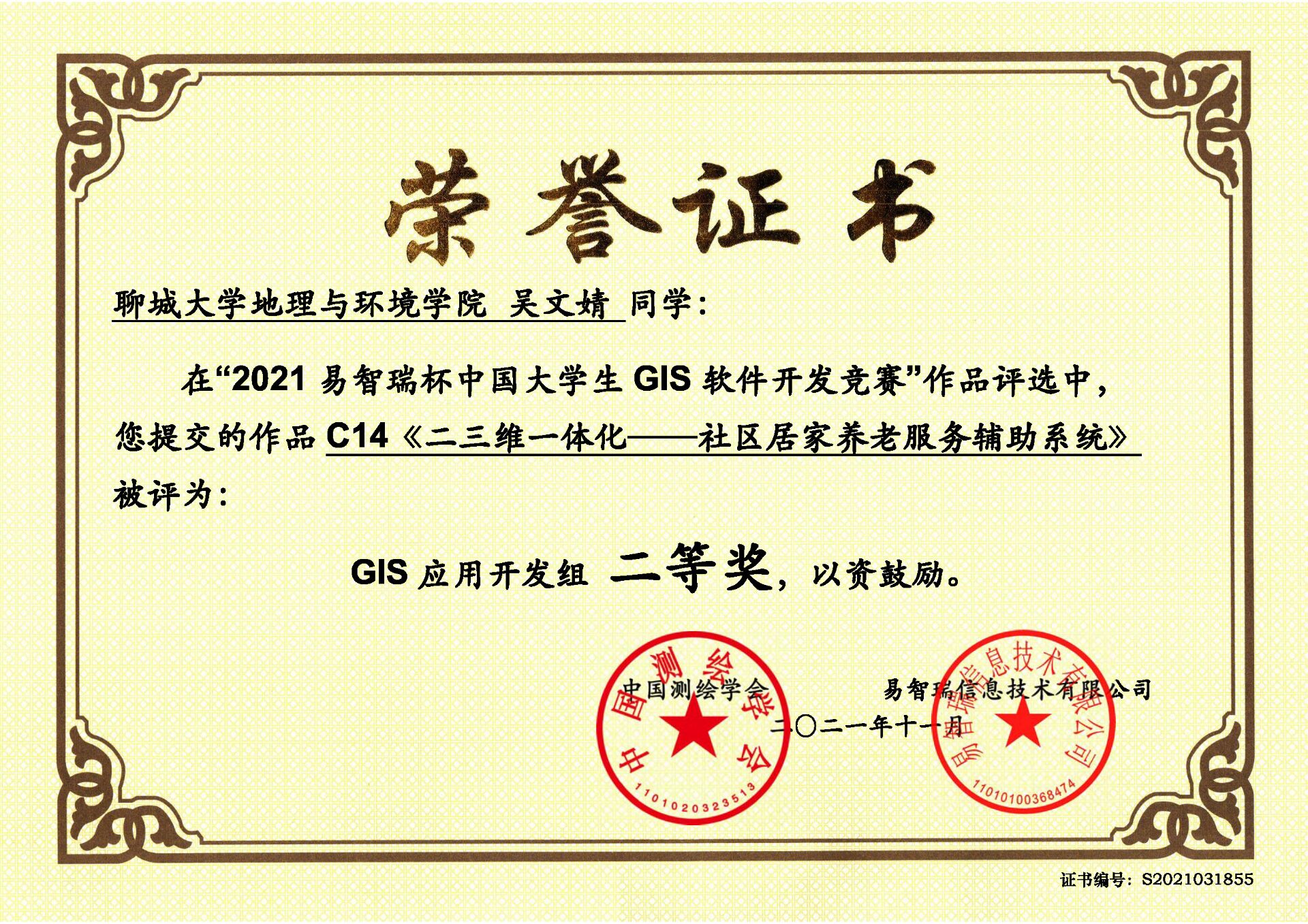 吴文婧在2021易智瑞杯中国大学生GIS软件开发竞赛中获得二等奖