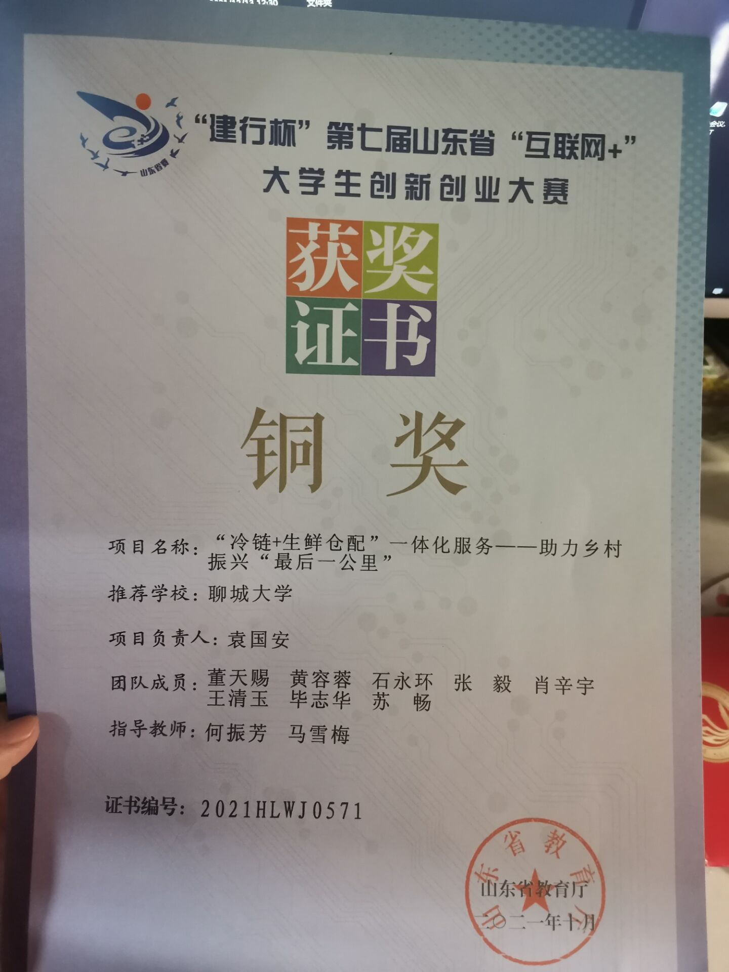 为提高科技创新意识,增强团体协作能力,2021年10月,黄容蓉、肖辛宇、袁国安、董天赐、石永环、张毅、王清玉、毕志华、苏畅在何振芳、马雪梅的指导下参加了“建行杯”第七届山东省“互联网+”大学生创新创业大赛,获得铜奖。