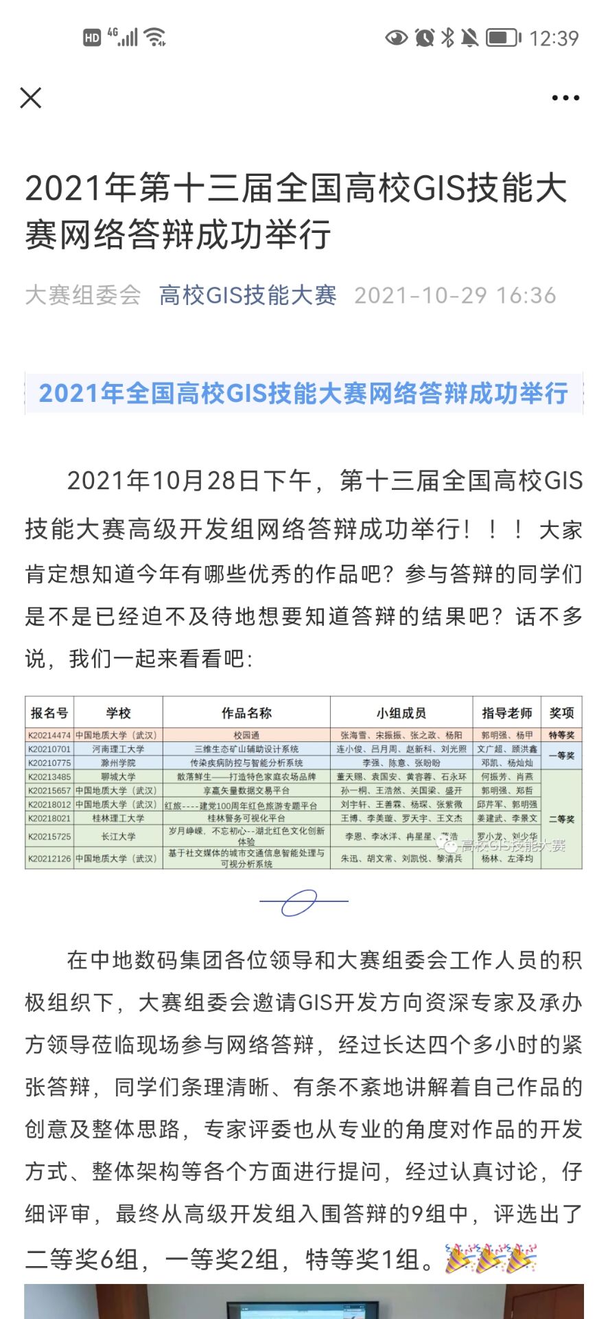 为提高科技创新意识,增强团体协作能力,2021年10月29日,黄容蓉、石永环、董天赐、袁国安在何振芳、肖燕的指导下参加了2021年第十三届全国高校GIS技能大赛网络答辩,获得二等奖。