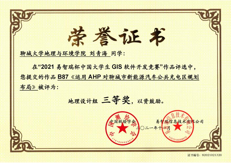 为提高科技创新意识,2021年11月,太阳成集团tyc33455刘青海参加了2021易智瑞杯中国大学生GIS软件开发竞赛,获得三等奖。