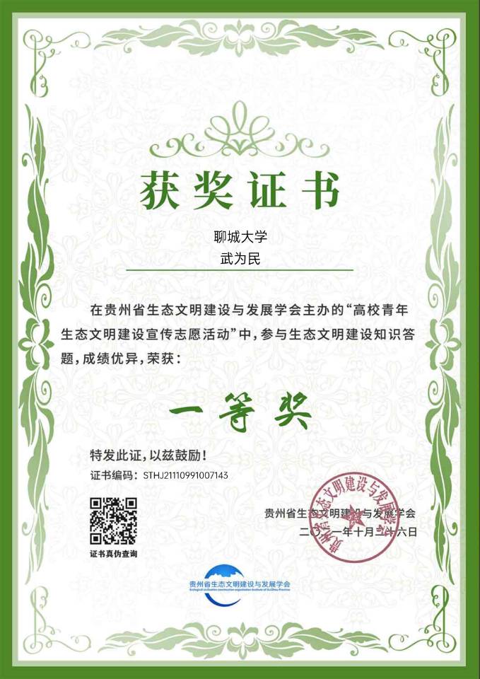 2021年10月26日,武为民参加高校青年 生态文明建设宣传志愿活动,获得一等奖。