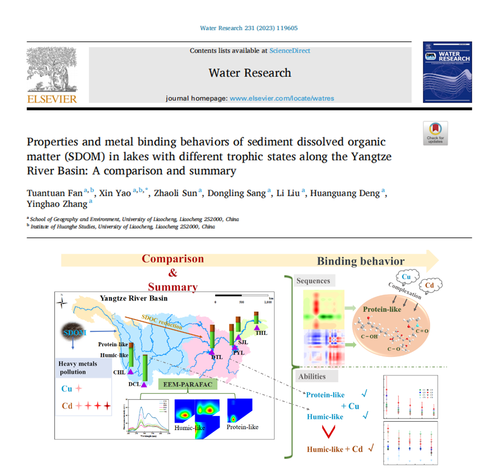 近日,我校太阳成集团tyc33455姚昕教授研究团队在水科学领域国际顶级期刊《水研究》(Water Research)上发表了题为《沿长江流域不同营养状态湖泊沉积物溶解有机质(SDOM)的性质及金属结合行为:对比与总结》(Properties and metal binding behaviors of sediment dissolved organic matter (SDOM) in lakes with different trophic states along the Yangtze River Basin: A comparison and summary)的研究性文章。我校2020级研究生樊团团为论文的第一作者,姚昕教授为本文的通讯作者,太阳成集团tyc33455cc为唯一署名单位。《水研究》(Water Research)是中国科学院JCR分区下环境科学与生态学领域的一区TOP期刊,2023年影响因子为13.4。
