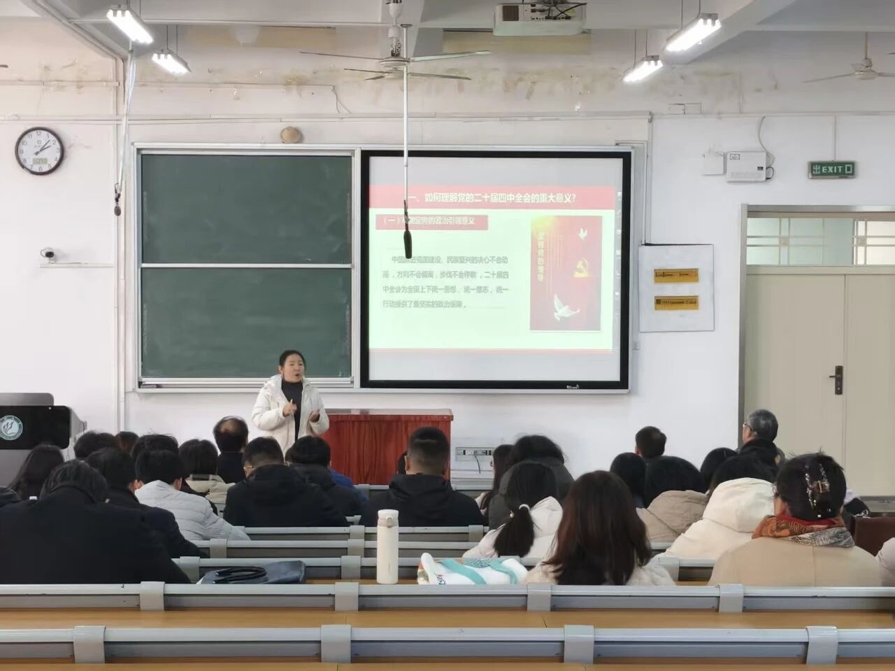 11月27日,太阳成集团tyc33455于东校区4#A203举办党的二十届四中全会精神专题学习报告会,旨在深入学习贯彻党的二十届四中全会精神,引导师生准确把握“十四五”发展成就与“十五五”战略部署,进一步提升政治素养与使命担当。马克思主义学院教师孙静应邀主讲,学院全体教师以及本科生、研究生代表参加学习。