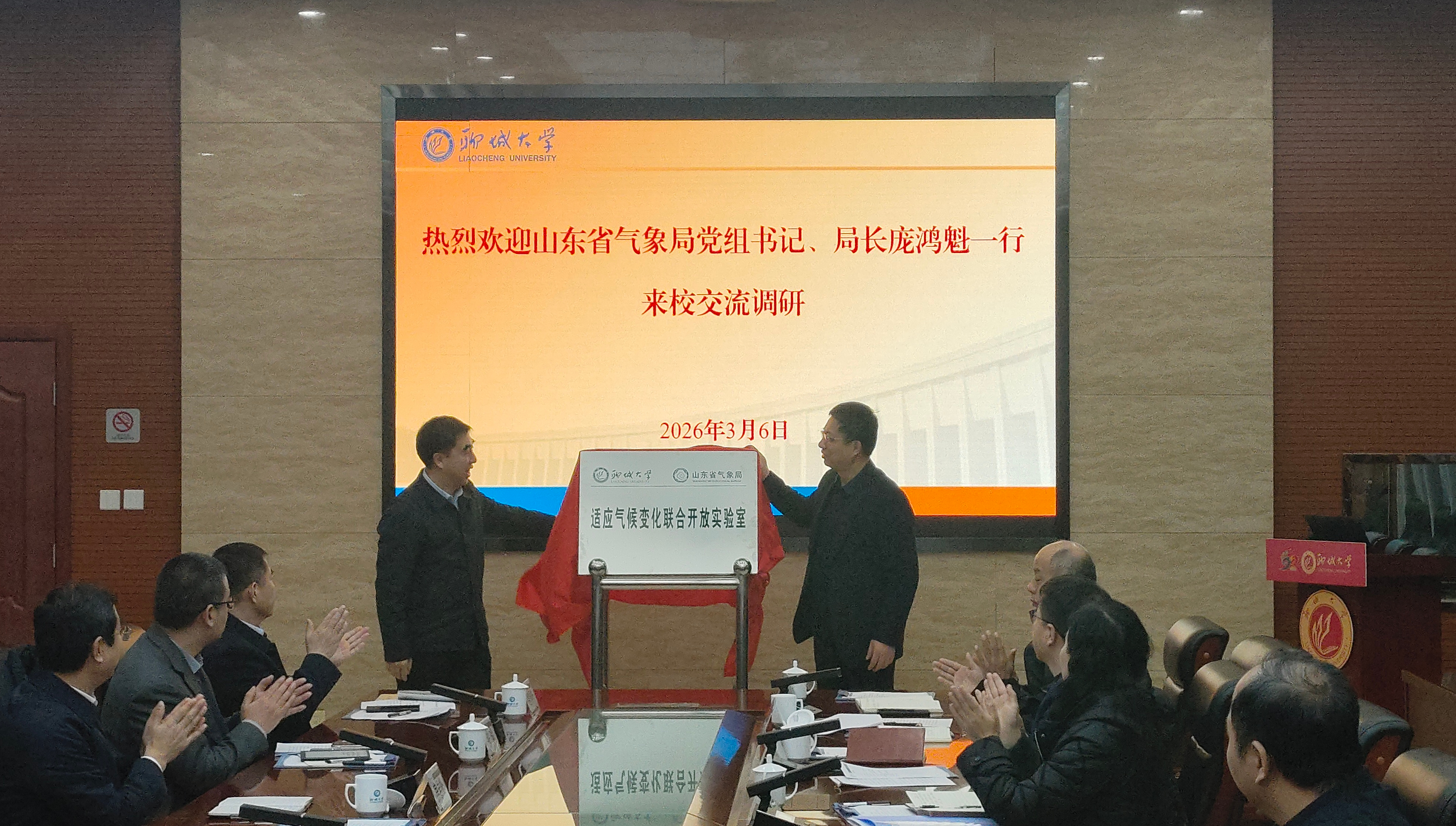 3月6日,山东省气象局党组书记、局长庞鸿魁一行来校调研,党委书记关延平热情接见。党委副书记、校长白成林与庞鸿魁共同为双方共建的“适应气候变化联合开放实验室”揭牌。党委常委、副校长李华锋主持活动。