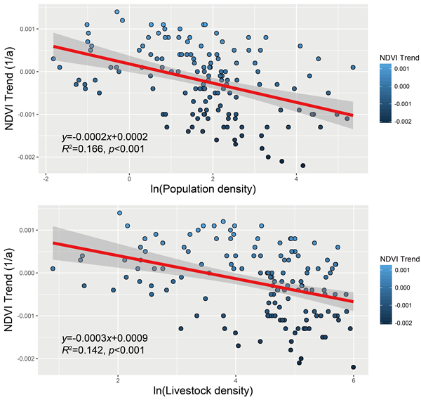 图2.1981-2015年以县为单位统计的归一化植被指数(NDVI)变化趋势与人口密度(a)、畜牧密度(b)的相关性
