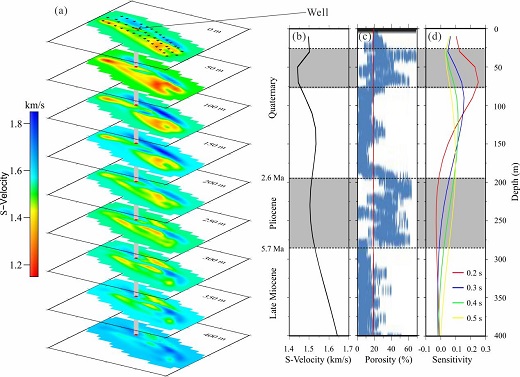 图2(a)岛礁三维S波速度结构不同深度的切片图,黑色星形为地震台站,灰色柱状为钻井位置;(b)钻井位置处的S波速度随深度变化;(c)钻井岩芯孔隙度随深度变化;(d)0.2 s、0.3 s、0.4 s和0.5 s不同周期群速度敏感核随深度变化。