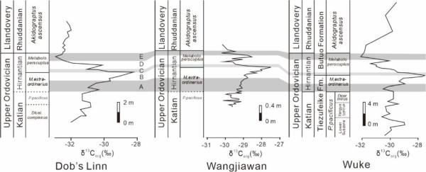 晚奥陶世末期,受沉积相控制,我国华南地区主要发育富有机质黑色页岩,仅在赫南特期短暂发育少量碳酸盐岩沉积。而乌科剖面,不仅出露了连续的上奥陶统碳酸盐岩地层,还保存了典型的晚奥陶世浅水底栖生物的化石、生物绝灭后的微生物岩(凝块石、核形石等),以及冰期后的暖水生物(图1)。在此基础上,研究人员将乌科剖面上奥陶统顶部识别出的(七个)典型沉积旋回与具有良好笔石生物带约束的深-浅水过渡剖面万和剖面的旋回一一对照,同时结合碳同位素地层学(图2),准确建立起乌科剖面上奥陶统时间地层格架,为后续在华南地区对LOME时期生物与环境相互作用的研究打下了基础。