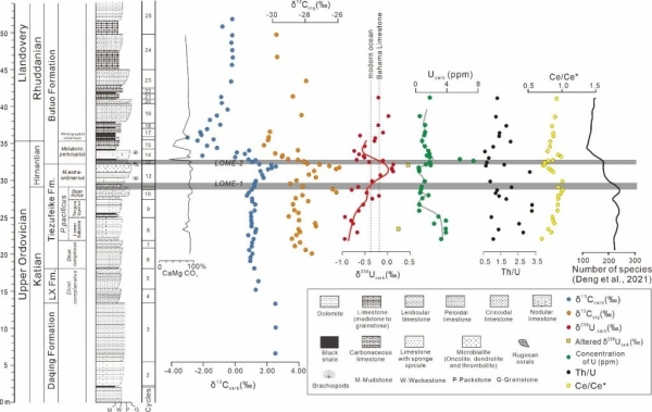 针对上述问题,中国科学院地质与地球物理研究所研究人员与美国耶鲁大学、斯坦福大学和中国地质大学(武汉)研究人员合作,在华南川滇交界的大凉山腹地,寻找到了完整记录晚奥陶世末生物幕式演化的连续浅水碳酸盐岩剖面——“乌科剖面,但由于奥陶系-志留系界线地层序列是基于浮游型笔石生物带确定的,与缺乏笔石的浅水碳酸盐地层对比就存在很大困难。为此,他们通过古生物演化序列及与典型界线剖面旋回地层和碳同位素地层的对比,建立了该剖面奥陶系-志留系界线地层格架,并通过铀同位素地球化学变化和数值模拟,明确了LOME时期全球海洋缺氧面积变化与生物演化和衰落的关系。