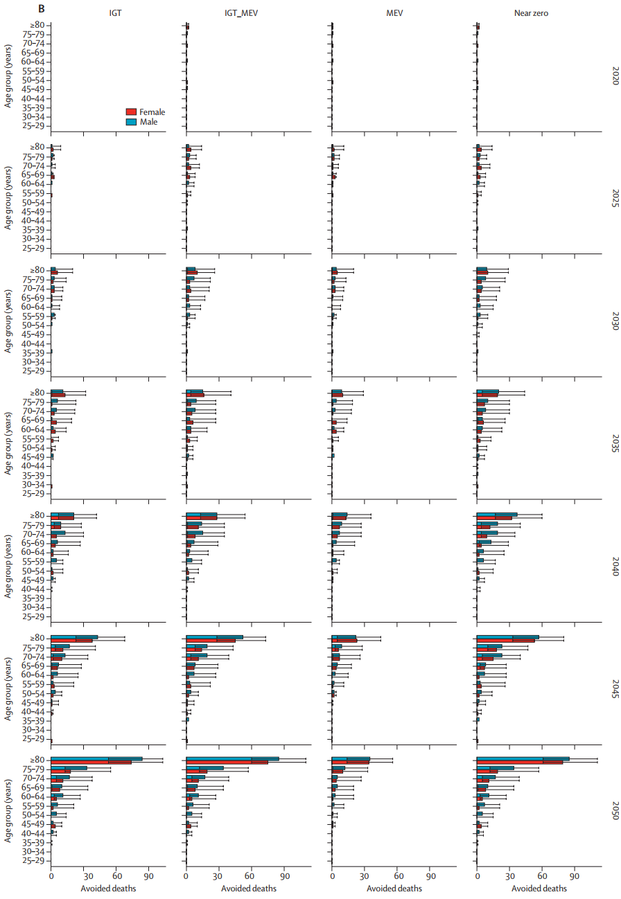 图1.四种交通减缓情景下可避免的死亡人数(年龄别和性别)