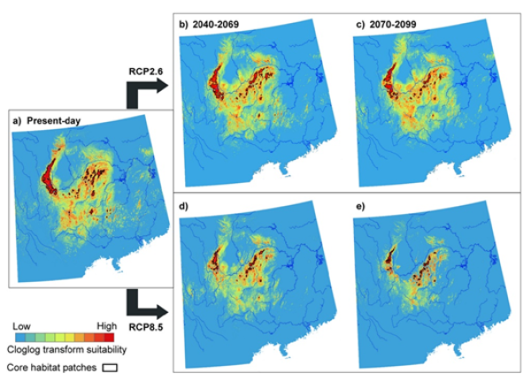 图2 气候变化背景下棘腹蛙适宜栖息地与核心斑块的空间格局