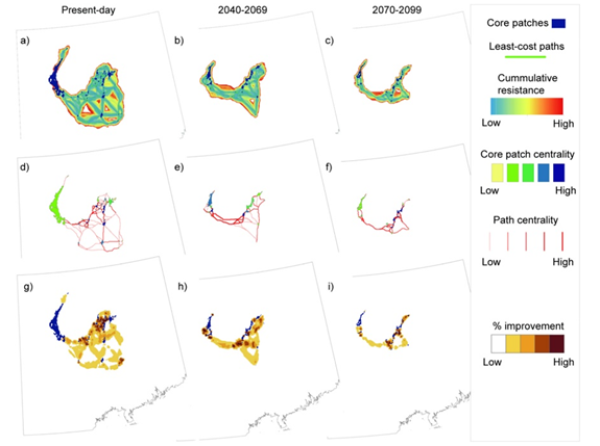 图3 气候变化背景下棘腹蛙适宜栖息地核心斑块间连通性的变化格局