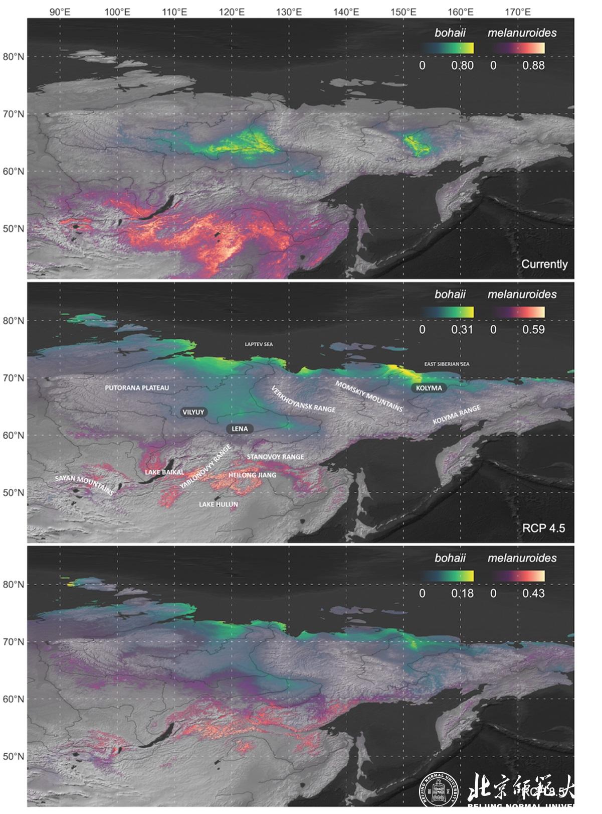物种分布模型预测的黑尾塍鹬渤海亚种和东方亚种的现有繁殖分布区(上)以及在2070年两种气候变化场景下(RCP 4.5、8.5)的繁殖分布(中、下)。图中栖息地的适宜度:从0(不适宜)至1(非常适宜)。
