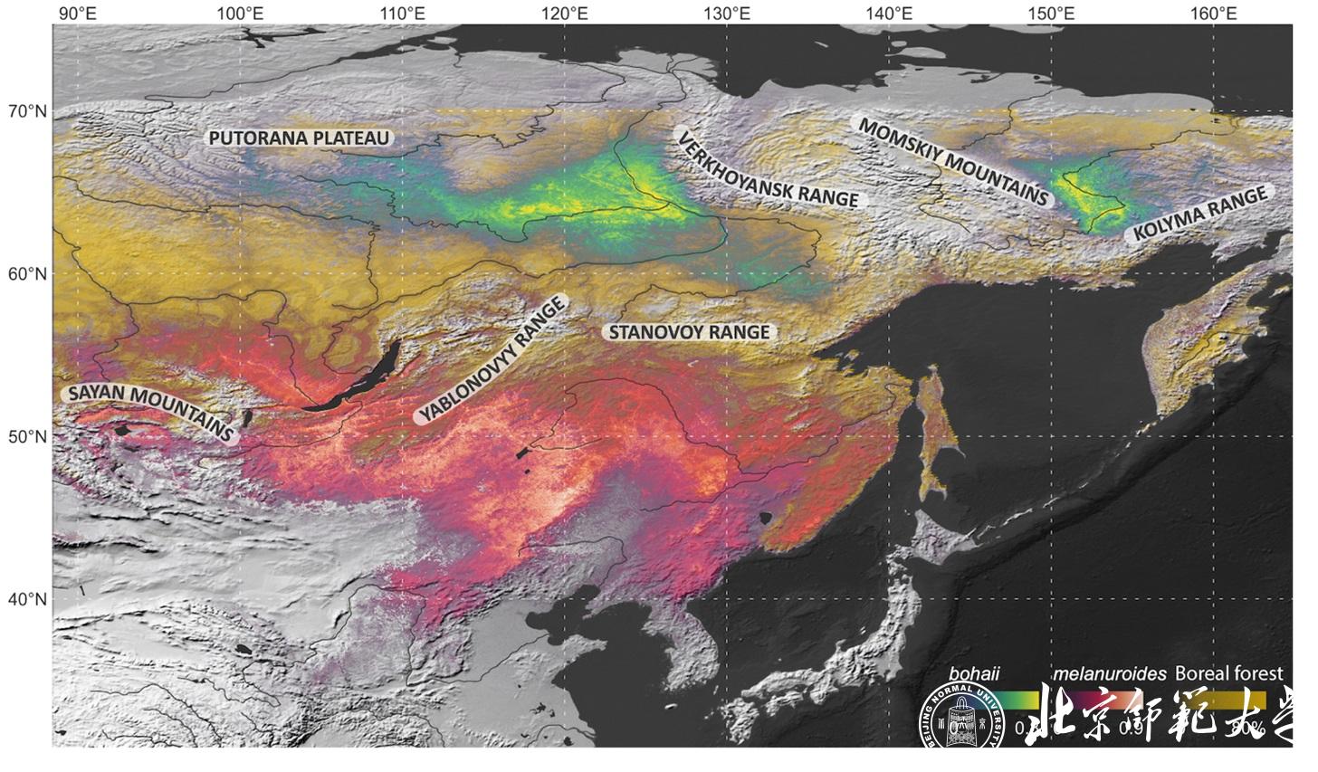黑尾塍鹬渤海亚种和东方亚种的繁殖地分布和北方针叶林相对位置