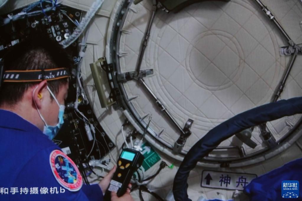 7月25日在北京航天飞行控制中心拍摄的神舟十四号航天员乘组进入问天实验舱。这是航天员陈冬开启问天实验舱舱门。新华社记者 郭中正 摄