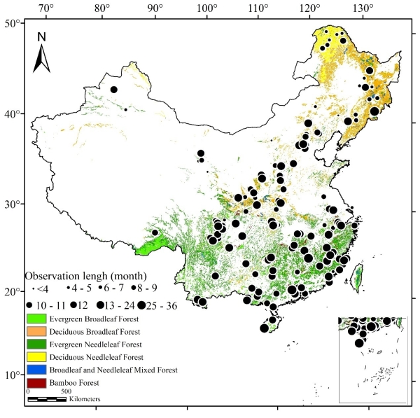 中国科学院植物研究所许振柱研究组收集整理568篇已发表的文献资料,运用数字化软件WEBPLOTDIGITIZER进行数据提取,构建了当前我国最完整的森林土壤碳排放数据库,包括土壤碳排放速率、观测方法、地理信息、林分特征和气候要素等详细信息,总样本量11297条。其中,年尺度数据从139条扩充至634条,月尺度数据从1782条扩充至5003条。研究表明,在全国尺度上,土壤温度是调控土壤碳排放的主导因子,可以解释约50%的变化,由此得到其温度敏感性在2.05-2.17之间。我国森林土壤碳年排放量变动于260-2058 g C m-2 yr-1,平均852 g C m-2 yr-1。通常在相同的气候带内,常绿林碳排放量大于落叶林,阔叶林大于针叶林。竹林在以往大尺度森林碳排放研究中常被忽略,却表现出最大的碳排放速率,平均1134 g C m-2 yr-1。该数据库的建立,对于探索我国乃至全球森林碳循环及其对气候变化的影响具有重要的理论和现实意义。