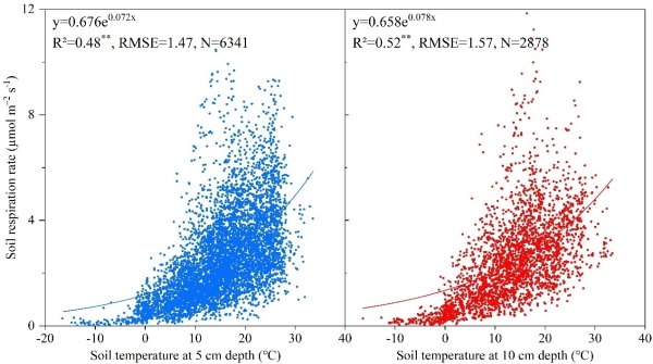 中国森林土壤碳排放速率与5 cm土壤温度(a)、10 cm土壤温度(b)指数关系图