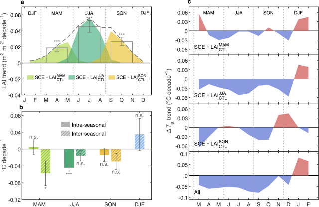 北半球各生长季节植被变化所产生的当季和跨季气温效应