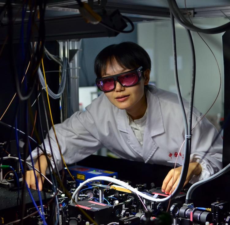 图 2 中科大研究生储艳清在调节氩-39原子阱激光系统。蒋蔚供图。