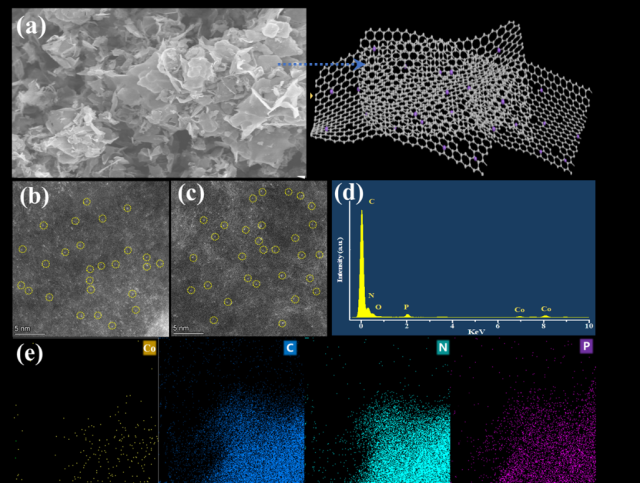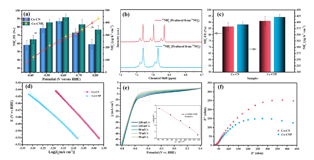 研究团队采用自然界极少的15NO3作为氮源,以同位素标记法进一步证明了氨生成的唯一氮来源为硝酸盐。利用1H核磁共振(NMR)仪对产生的氨进行检测,14NH4+15NH4+的核磁谱图分别具有典型的三峰和双峰结构。研究采用多种实验分析手段对载体结构进行了分析。结果表明,磷的掺杂进一步提高了碳氮载体的缺陷程度,提供了更多的固定位点负载单原子钴,并且缺陷位点会对相邻金属钴活性位点的电子结构和性能产生影响,提高了电极导电性。