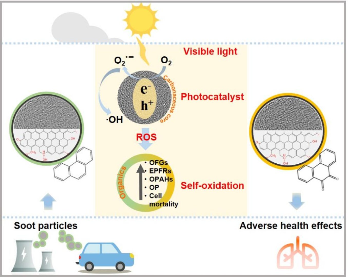 烟炱颗粒的光催化自氧化过程:ROS的生成和增强的负面健康效应