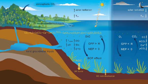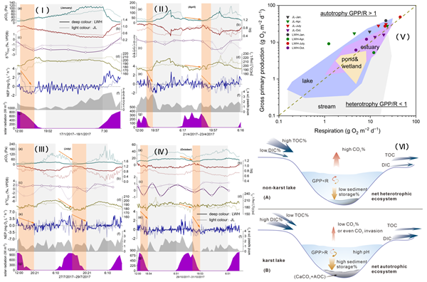 近日,中国科学院地球化学研究所环境地球化学国家重点实验刘再华课题组利用季节性昼夜尺度观测数据、水文地球化学模拟和bookkeeping模型等研究手段,对典型喀斯特湖泊水体-抚仙湖的代谢过程与溶解无机碳(DIC)的相关关系来调控碳与物质能量在湖泊生态系统中的转移过程以及水体碳源汇展开了分析研究,并对监测期日间午后水体代谢显著降低的现象进行细致的机理分析。