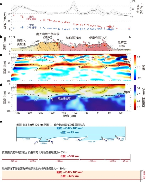 图2.a、沿剖面GPS速率及应变率;b、构造分区及断层滑移速率;c、CCP叠加成像结果;d、联合反演获得的S波速度结构;e、平衡剖面估算地壳缩短量