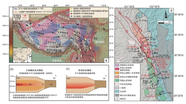 青藏高原作为“世界屋脊”,其形成演化,特别是内部的地壳变形、加厚隆升以及向外扩张等,是地球科学领域研究的重点内容。针对青藏高原东缘特殊的地质现象,如大规模的走滑断层,显著的地壳加厚及缺少新生代地壳缩短等,前人提出了三个经典的地质学模型,分别是刚性块体挤出、岩石圈尺度连续变形以及大规模的中下地壳流。其中,大规模(>1000km)的中下地壳流在最近20年间受到众多学者的广泛关注和支持。该模型认为,青藏高原东缘的地壳加厚是由于地壳物质在25-40km的深部从青藏高原的内部(北羌塘地块)向东流动,加入到青藏高原东缘导致的。地球物理观测结果显示,在青藏高原东缘和内部存在广泛的低速高导层,支持中下地壳物质可以发生流动。但是,也有学者对此提出质疑,认为该模型缺少地质证据,而且近年的一些研究结果也似乎不支持这种大规模的地壳流存在。