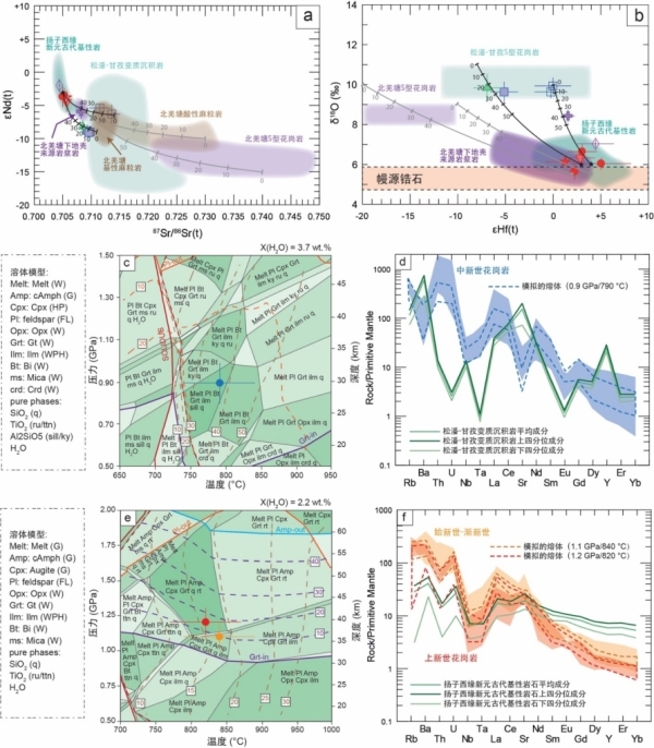 图2 贡嘎山-折多山花岗质岩石同位素特征与新生代岩石热力学及微量元素模拟分析结果。空心符号代表中生代样品,实心符号代表新生代样品。模拟分析结果显示新生代岩石的形成深度与地壳流模型一致,但是同位素组成表明这些岩石来自于原地地壳物质的部分熔融,其源区组成与中生代岩石一致