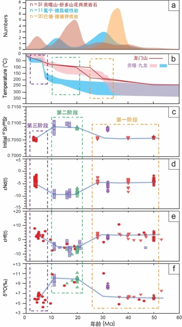 图3 贡嘎山-折多山新生代花岗质岩石同位素组成随时间的变化及其与区域岩浆-构造作用的关系。新生代的岩浆源区经历了两次转变,可以与区域构造抬升历史和岩浆作用进行对比,表明青藏高原东缘岩浆作用与构造作用联系密切。软流圈地幔的上涌与持续的挤压碰撞作用共同塑造了青藏高原东缘。