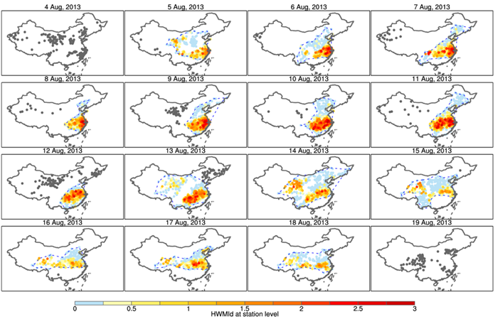 图1:2013年8月中国区域性极端热浪的时空动态演变。图中圆点代表发生极端高温的站点:其中,彩色圆点代表隶属此次区域性极端热浪的高温站点,灰色圆点代表隶属同时期其他区域性极端热浪或者孤立的高温站点,颜色由蓝到红对应高温强度由低到高。蓝色虚线表示此次区域性极端热浪随时间变化的空间范围。