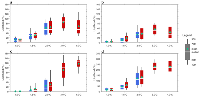 图2:在五种升温水平下,当前和未来不同量级的中国区域性极端热浪发生概率:(a)严重型(量级指数介于1-2;与2013年中国区域性极端热浪相当);(b)非常严重型(量级指数介于2-4);(c)超级严重型(量级指数大于4);(d)三类热浪事件的总和。蓝色和红色分别代表RCP4.5和RCP8.5情景下的模拟和预估结果。盒须图分别表示多模式集合的下十分位数、下四分位数、中位数、上四分位数以及上十分位数;绿色圆点代表多模式集合平均值。