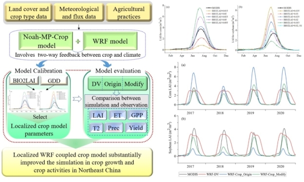 中国科学院东北地理与农业生态研究所、美国太平洋西北国家实验室、长春师范大学、中科院大气物理研究所、中国气象局、中科院沈阳生态研究所合作,选择我国东北地区为研究区,以玉米和大豆为研究对象,利用高分辨率卫星观测数据对区域气候与动态农作物耦合模型进行参数校准与优化,改善了动态农作物模型在中国东北地区的应用,弥补了传统模式的缺点,提高模型与现实的契合度。在此基础上,研究基于卫星观测数据、气象观测数据、通量观测数据和统计数据对改进的动态农作物模型在模拟农作物长势(LAI)、生理(ET)、碳通量(GPP)及产量方面进行评估。研究表明:与传统的动态植被模型与未经修正的作物模型相比,改进的动态农作物模型显著改善了作物物候、作物长势、作物生理、碳通量及产量等方面的模拟。该耦合模型在估计和预测未来气候变化下作物生长和产量方面具有显著优势。本研究为区域作物陆-气耦合、作物生长状态精准模拟和产量预测提供了新的研究思路。