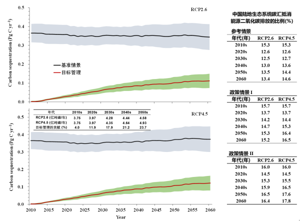 中国科学院植物研究所联合中科院大气物理研究所、中山大学、沈阳农业大学、吉林大学,对2010年至2060年中国陆地生态系统碳汇变化及其在抵消能源二氧化碳排放中的作用进行系统研究。结果表明,2010s中国陆地生态系统平均每年固碳3.8亿吨,至2050s将增加到每年4.6至4.9亿吨。在各类陆地生态系统中,森林碳汇强度最大,占比68%至71%,农田占12%至13%,其他生态系统(湿地、草地和灌丛)占17%至19%。实施目标管理将提升陆地生态系统碳汇强度,2050s目标管理对中国陆地碳汇的贡献将接近24%。在不同的政策和气候情景下,至2030和2060年,中国陆地生态系统碳汇可分别抵消碳达峰时能源二氧化碳排放量的12%至15%和13%至18%。