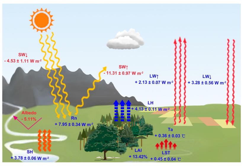 地处黄河流域中游的黄土高原在我国经济社会发展和生态安全方面具有十分重要的地位,也是黄河流域生态保护和高质量发展重大国家战略重点关注区域。为改善黄土高原植被覆盖状况,治理水土流失,国家自20世纪90年代开始实施退耕还林(草)工程。该工程实施二十多年以来,大量坡耕地被转化为草地和林地,区域植被覆盖水平明显提高,入黄泥沙大幅降低。植被建设可通过改变土地利用类型、植被覆盖度和地表反照率等对黄土高原水文气候过程产生影响。如何科学评估和认识黄土高原大规模植被建设的水文气候效应是广受关注的热点科学问题。