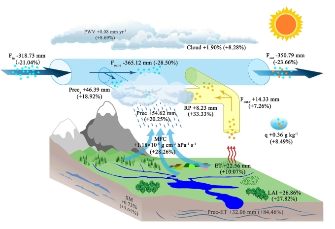 图2:黄土高原大规模植被建设对区域大气水循环影响机理示意图